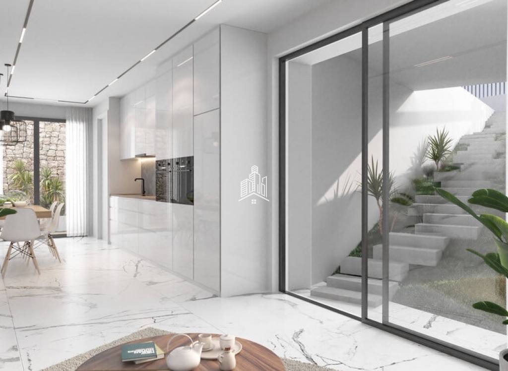 The open-plan living room flows seamlessly into the kitchen and dining area, making it the heart of the home. A cozy fireplace adds warmth to the space, while large sliding glass doors lead to the terrace, creating a harmonious indoor-outdoor living experience.