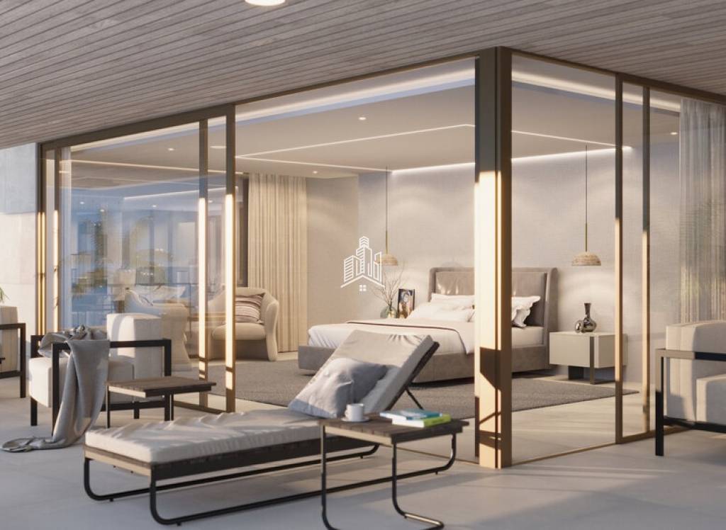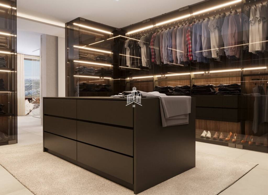 Le premier étage se compose de deux ailes. L'aile gauche abrite la spacieuse suite parentale avec salle de bains attenante, toilettes et dressing. Ce dernier est doté d'un îlot central permettant de ranger vos bijoux et sacs à main les plus précieux. Cet îlot dissimule également un élément décoratif. La terrasse privée de la suite parentale comprend un espace détente et des chaises longues. L'aile gauche abrite également un bureau et une bibliothèque, tous deux dotés de fenêtres s'ouvrant entièrement, tout comme celles du salon. L'aile droite comprend deux autres chambres avec salles de bains attenantes et terrasses privatives. Le niveau inférieur comprend une cave à vin, un bar, une salle de cinéma, une salle polyvalente avec billard et espaces de détente, une salle de sport entièrement équipée et un spa avec piscine intérieure chauffée, sauna, hammam et douche hydromassante. La salle de sport offre une vue panoramique. Le spa bénéficie d'une vue imprenable non seulement sur le littoral, mais aussi sur la cascade de la villa. De plus, ce niveau comprend un appartement de service avec son propre salon, sa cuisine et sa salle de bains, avec une entrée privée et un accès direct à la cuisine principale.