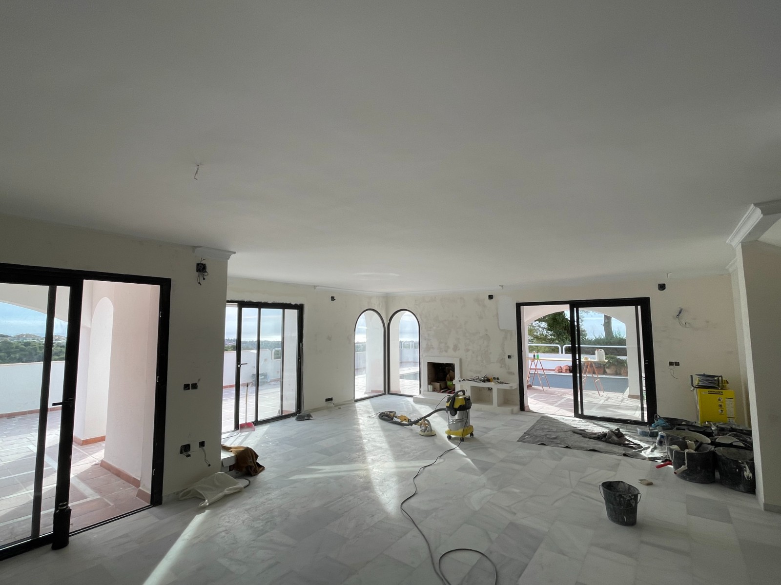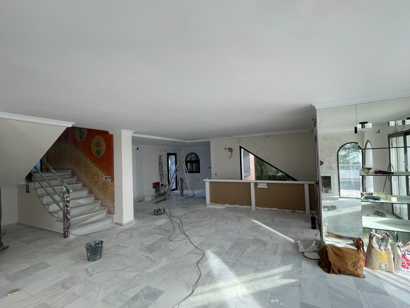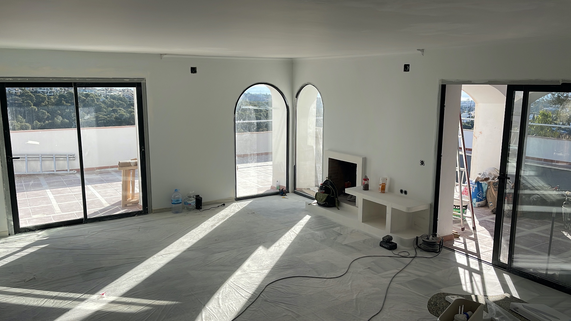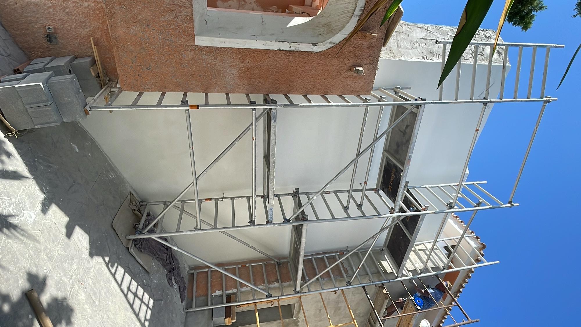 We zijn net klaar met het interieur en zijn daarna verder gegaan met de buitenkant: Volledige reparatie en renovatie van de gevel, structurele versterking van de kelderbasis aangezien het een hangend huis is, nieuw zwembad, volledige renovatie van het terras met typisch Andalusische terracotta tegels. .