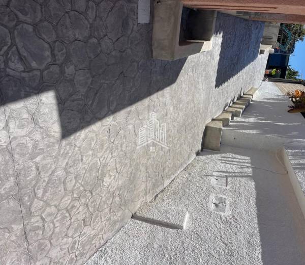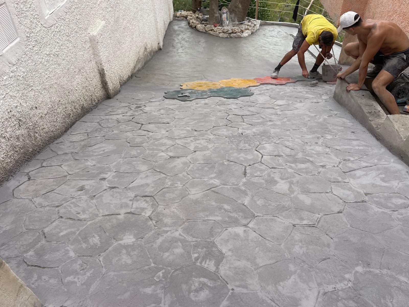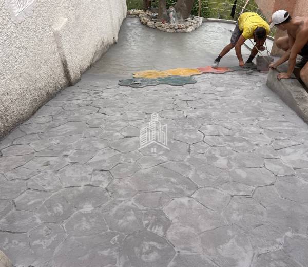 grondwerk voor de toegang rondom de woning, daarna beton met natuursteenindruk met waterdichte waterafstotende hars