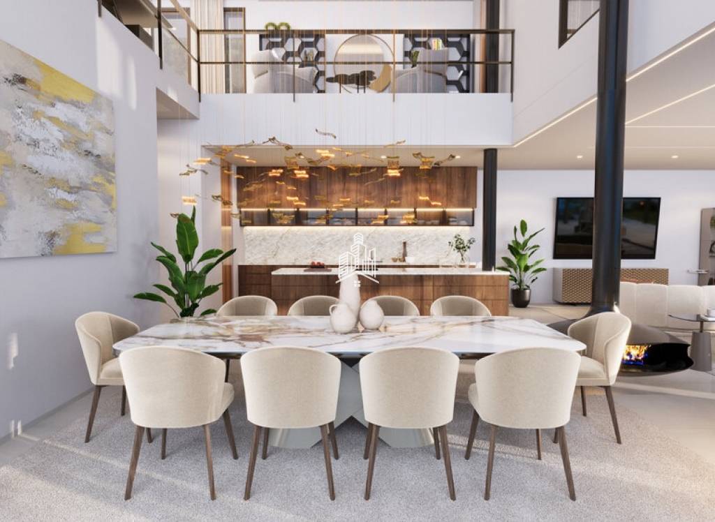 En la planta baja, la entrada principal da paso al ala izquierda, que alberga una sala de estar diáfana con salón-comedor y una cocina de doble altura. El salón cuenta con una chimenea suspendida con control remoto y llamas regulables. Una puerta desde la cocina da acceso a la cocina de servicio, que cuenta con una entrada independiente para el personal.