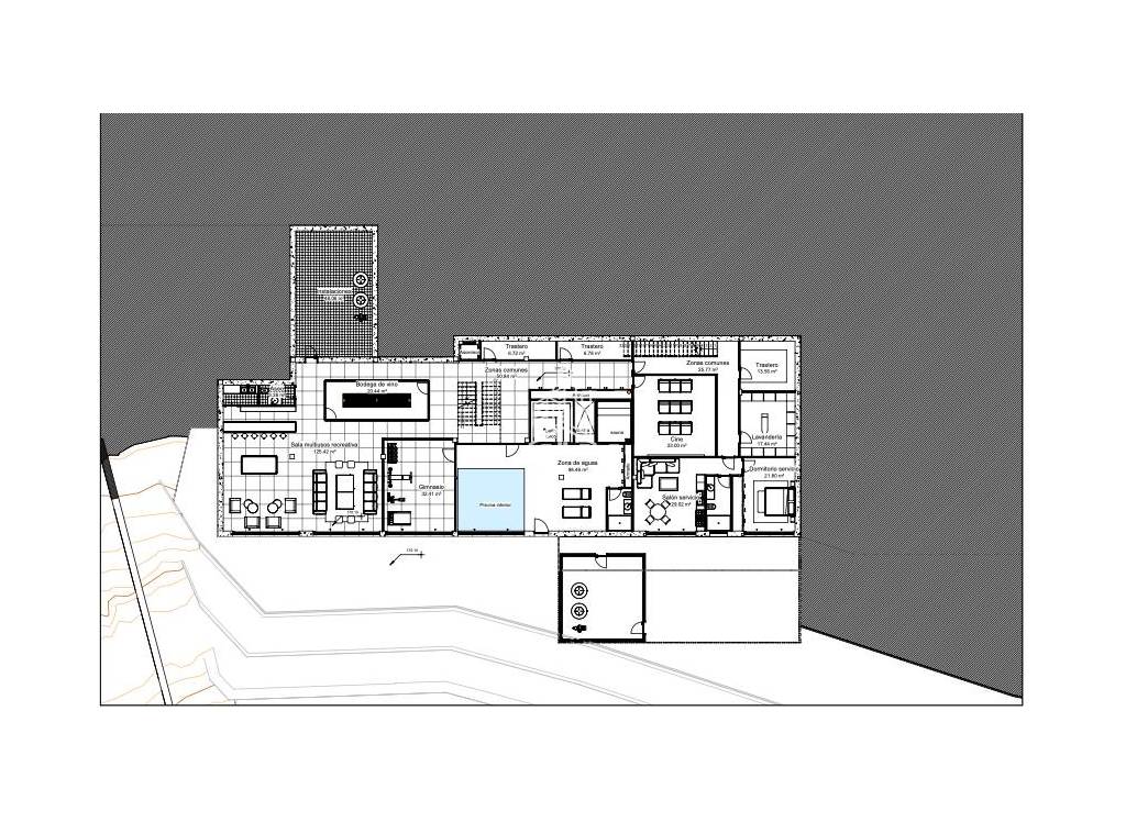 La primera planta consta de dos alas. El ala izquierda alberga la espaciosa suite principal con baño en suite, aseo y vestidor. El vestidor cuenta con una isla central para guardar sus joyas y bolsos más preciados. Esta isla también esconde un elemento decorativo. La terraza privada de la suite principal cuenta con una zona de relax y tumbonas. El ala izquierda también alberga un despacho y una biblioteca, ambos con ventanas que se abren completamente, al igual que las del salón. El ala derecha alberga dos dormitorios más con baño en suite y terrazas privadas. La planta baja incluye una bodega, un bar, una sala de cine, una sala multiusos con mesa de billar y zonas de relax, un gimnasio totalmente equipado y un spa con piscina cubierta climatizada, sauna, baño de vapor y ducha de hidromasaje. El gimnasio ofrece vistas panorámicas. El spa ofrece impresionantes vistas no solo de la costa, sino también de la cascada de la villa. Esta planta también incluye un apartamento de servicio con salón, cocina y baño propios, con entrada privada y acceso directo a la cocina principal.