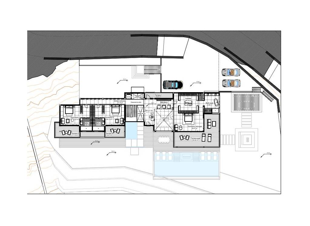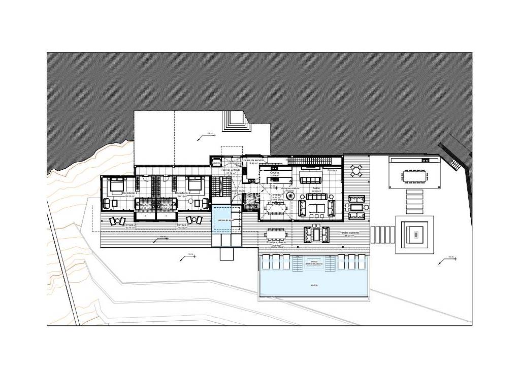El salón da directamente a la terraza parcialmente cubierta, que ofrece zona de comedor y relax, además de una barbacoa con asientos. La terraza también cuenta con una piscina infinita.